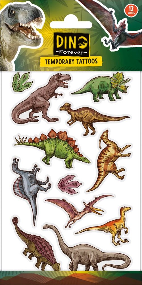 Przenieś się do prehistorycznego świata z kolorowymi tatuażami z dinozaurami! W zestawie znajdziesz różnorodne wzory przedstawiające ulubione dinozaury: T-Rexa, triceratopsa, stegozaura i wiele innych. Idealne na urodziny, zabawy tematyczne lub jako drobny prezent dla małego miłośnika dinozaurów.