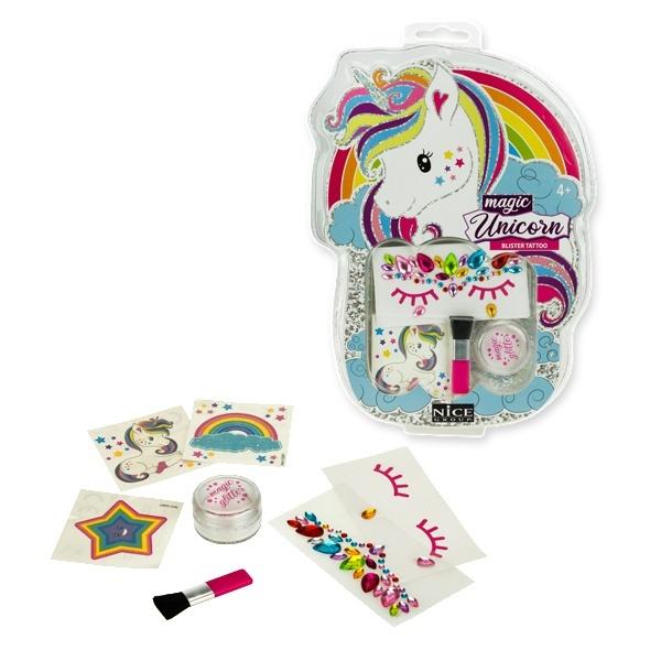 Jednorożec zestaw; brokatowe tatuaże, diamenciki na twarz.