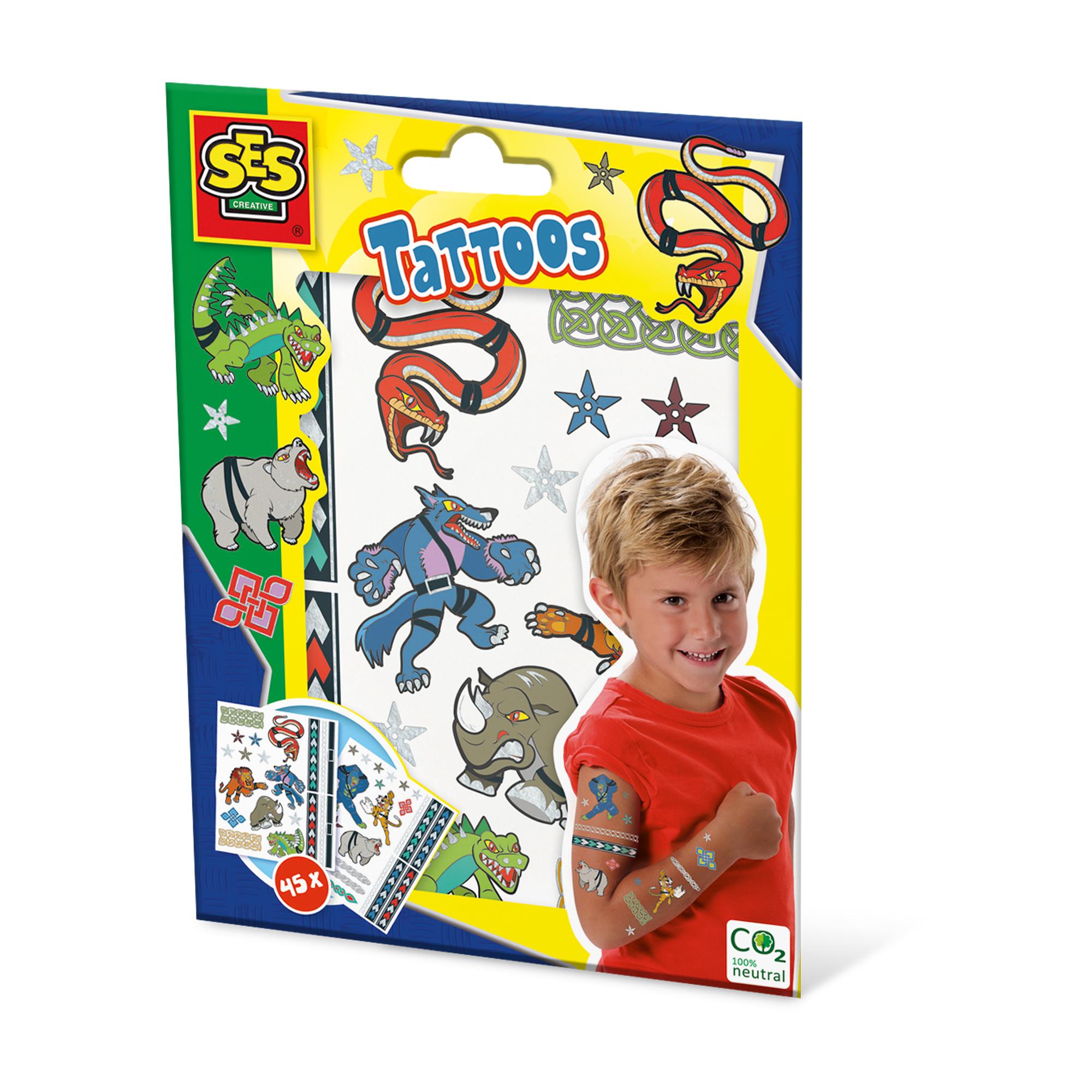 Zestaw zawiera 45 tymczasowych tatuaży przedstawiających zwierzęcych wojowników, gwiazdy i inne wzory.