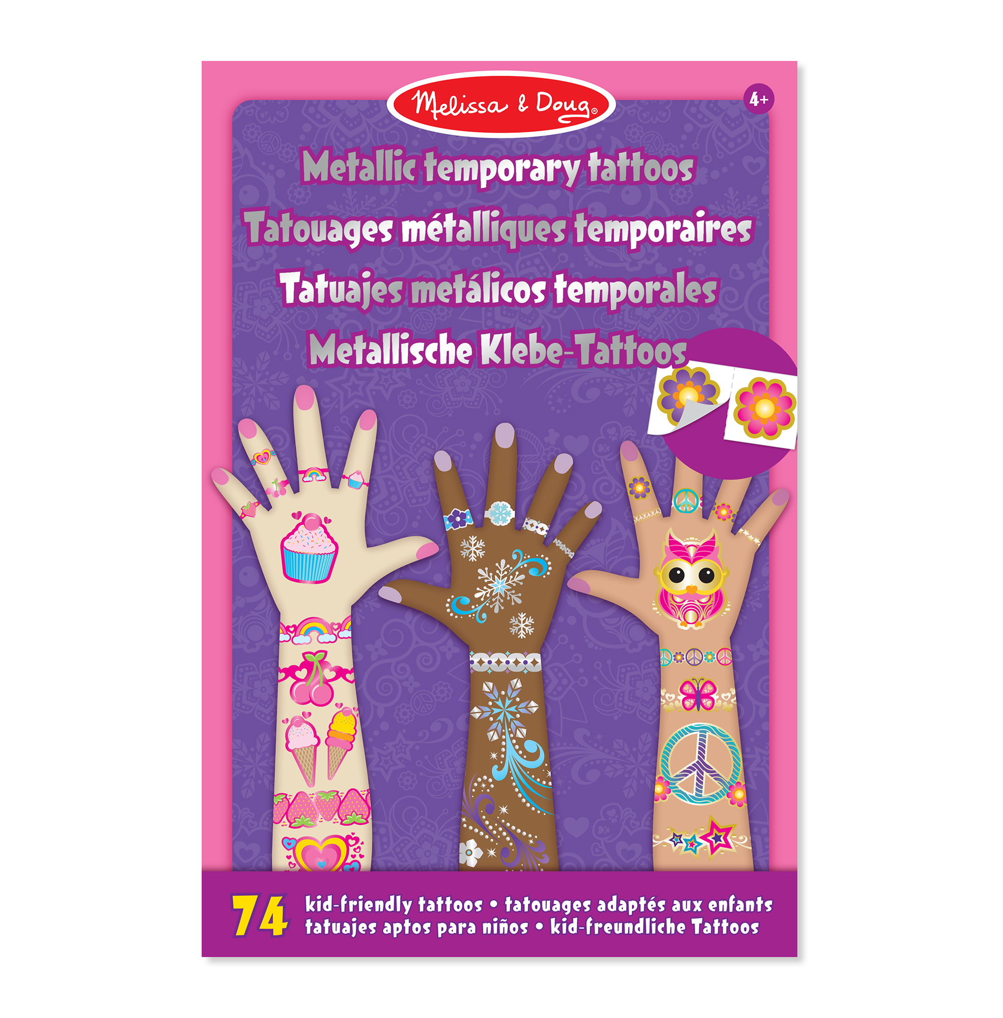 Chyba każdy z nas pamięta gumy do żucia do których był dołączany losowo zmywalny tatuaż? Ta moda wraca jak bumerang, tyle że bez potrzeby zjadania tony słodyczy aby ozdobić swoje ciało. Melissa&Doug oferuje nam zestaw 70 sztuk tatuaży dla dziewczynek. Wybrany wzór wystarczy przykleić, nawilżyć wodą i odczekać. Już po chwili będziemy mogli cieszyć się piękną błyszczącą ozdobą na swoim ciele. Tatuaże są zmywalne i całkowicie bezpieczne.