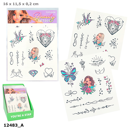 Tatuaże Top Model, w zestawie 2 karty z kolorowymi tatuażami.