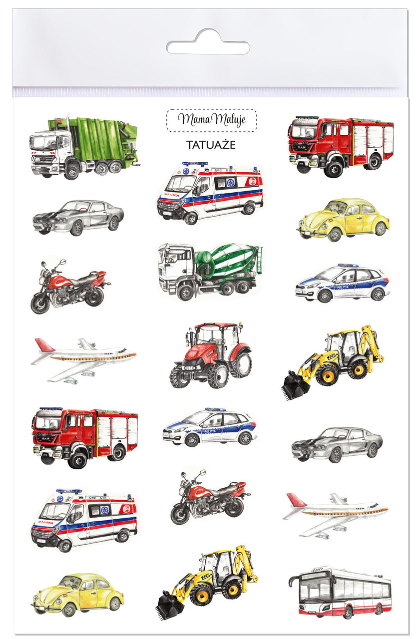 Zostały one wykonane na podstawie ręcznie malowanych ilustracji akwarelowych. Uwzględniają szczegóły i wyjątkowy charakter każdego pojazdu. Na arkuszu znajduje się 20 tatuaży.