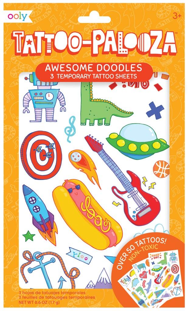 Ooly Tattoo Palooza to ponad 50 kolorowych, wesołych tatuaży dla dzieci zebranych na 3 arkuszach 13x21cm każdy. Łatwe w użyciu i całkowicie zmywalne.