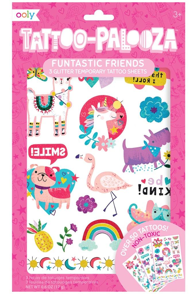 Ooly Tattoo Palooza to ponad 50 kolorowych, wesołych tatuaży dla dzieci zebranych na 3 arkuszach 13x21cm każdy. Łatwe w użyciu i całkowicie zmywalne.