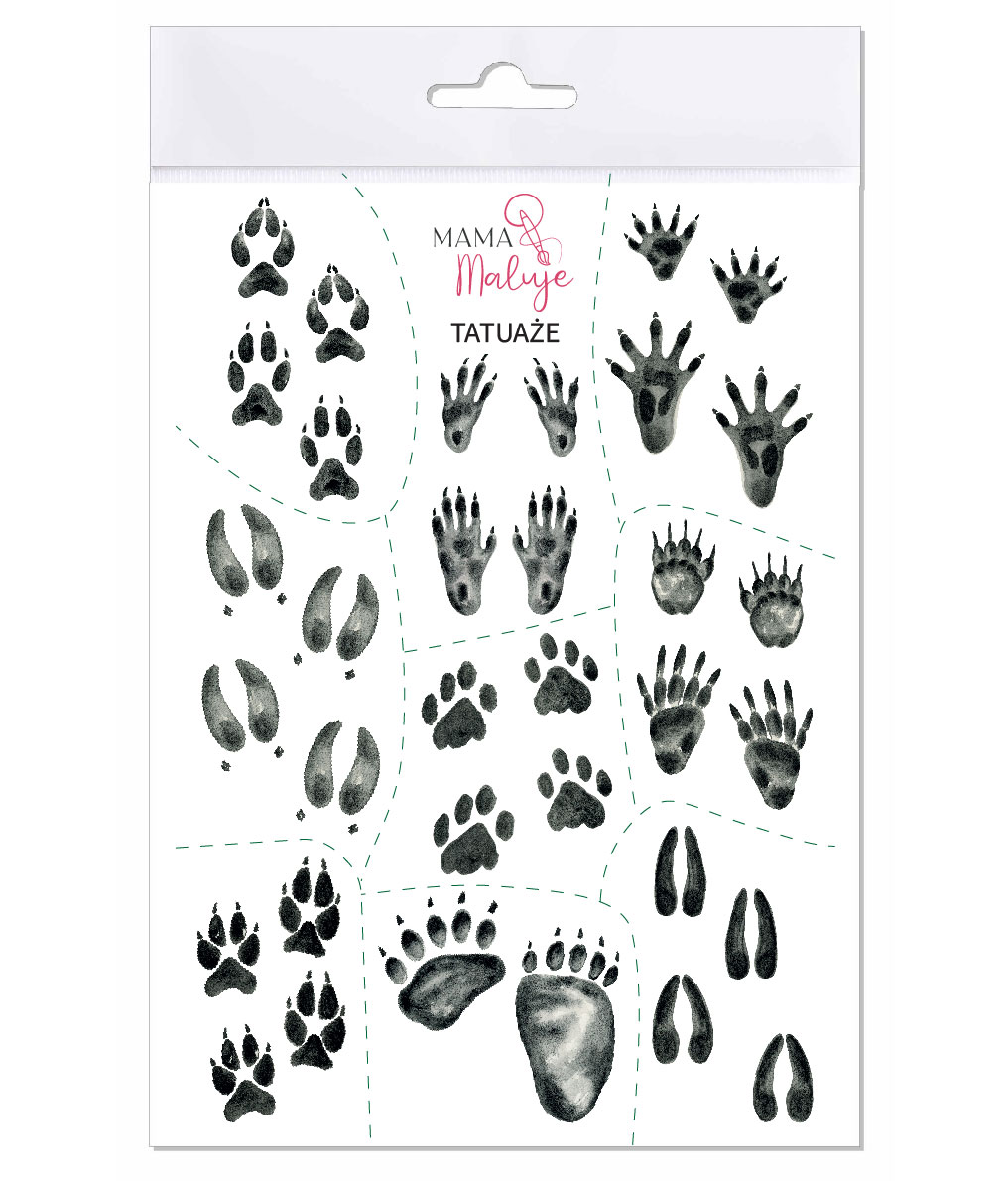 Na arkuszu znajdują się tropy: dzika, sarny, niedźwiedzia, wilka, lisa, rysia, wiewiórki, bobra i borsuka.