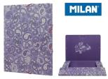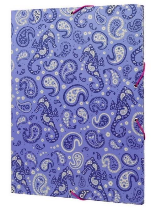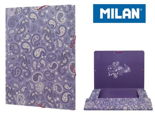 Teczka/Folder MILAN cienka na 2 wytrzymałe gumki. Może pomieścić format A4 (33.5 x 26 cm) o grubości 1 cm. Wykończenie z nadrukiem DROPS pasującym do kolekcji. Fioletowe wnętrze. Wymiary: 33,5 x 25,0 x 1,7 cm"