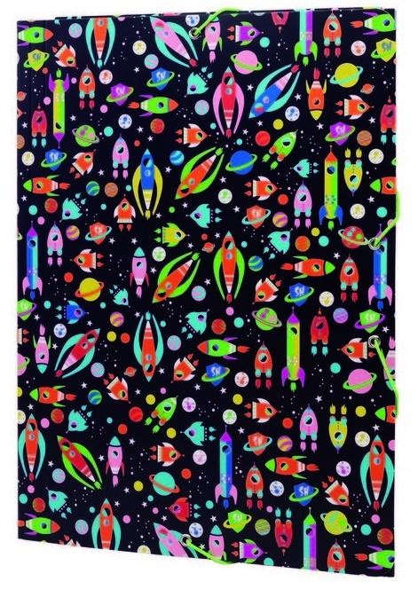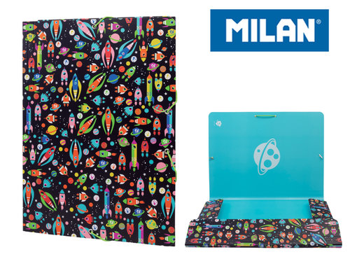 Teczka/Folder MILAN cienka na 2 wytrzymałe gumki. Może pomieścić format A4 (33.5 x 26 cm) o grubości 1 cm. Wykończenie z nadrukiem SUPER HEROES SPACE pasującym do kolekcji. Niebieskie wnętrze. Wymiary: 33,5 x 25,0 x 1,7 cm.