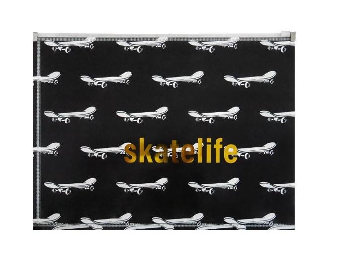 Teczka w formacie A4 z zapięciem strunowym. W kolorze czarnym ze złotym nadrukiem skatelife oraz białymi deskorolkami.