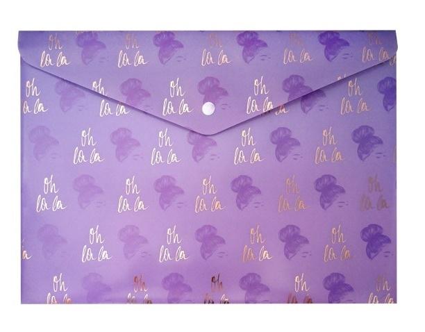 Teczka w formacie A4 koloru fioletowego z nadrukiem dziewczyny oraz ze złotymi napisami Oh la la. Zapinana na zatrzask.