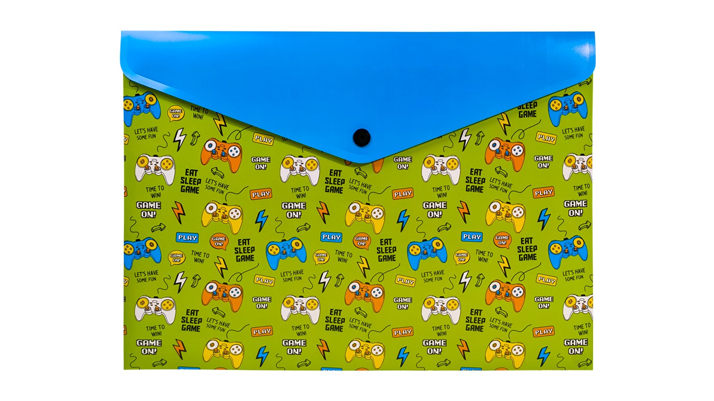 Teczka kopertowa wykonana z folii PP z pełnym, ozdobnym nadrukiem na całej powierzchni oraz klapą w kontrastowym kolorze.