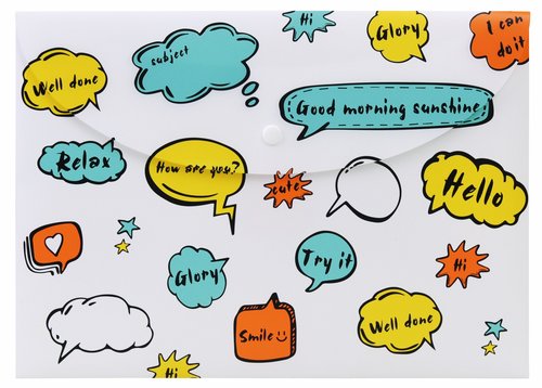 Teczka kopertowa zamykana na zatrzask format A4,o wymiarach 33,5 x 23,5 cm, Zakładka kopertowa o szer. 7 cm. Materiał: Polipropylen z nadrukiem offsetowym.