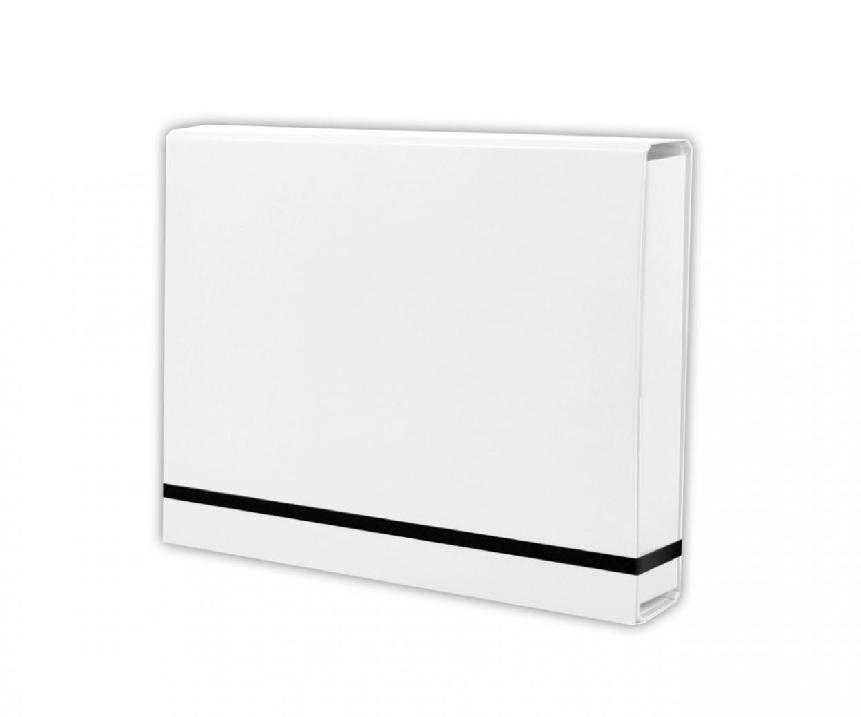Wykonana z tektury 1,7mm, nitowane boki z okleinowanymi krawędziami, zapinana na płaską gumkę 10 mm. Okleina w jednolitym kolorze uszlachetniona błyszczącą folią polipropylenową. Wymiary w cm; 32X23,5X4,5