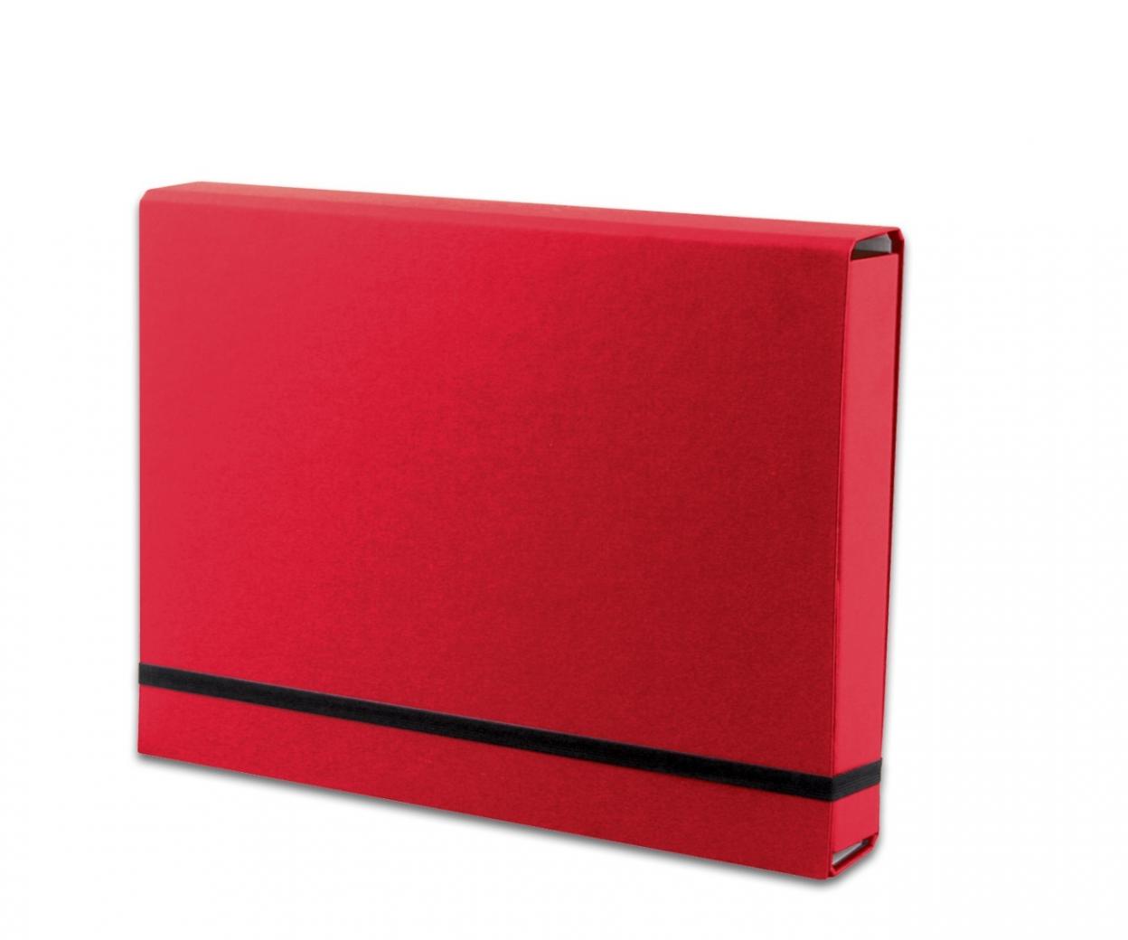 Wykonana z tektury 1,7mm, nitowane boki z okleinowanymi krawędziami zapinana na płaską gumkę 10 mm. Okleina Ecoline mat.. Wymiary w cm; 32X23,5X4,5