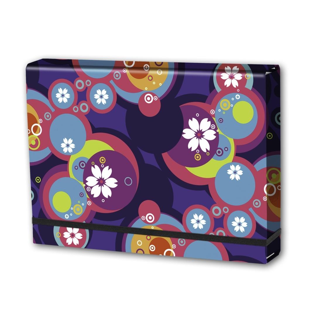 Wykonana z tektury 1,7mm, nitowane boki z okleinowanymi krawędziami, zapinana na płaską gumkę 10 mm . Wzorzysta okleina uszlachetniona błyszczącą folią polipropylenową. Wymiary w cm; 32X23,5X4,5