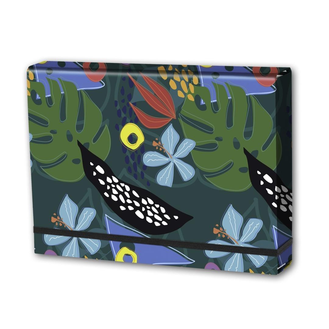 Wykonana z tektury 1,7mm, nitowane boki z okleinowanymi krawędziami, zapinana na płaską gumkę 10 mm . Wzorzysta okleina uszlachetniona błyszczącą folią polipropylenową. Wymiary w cm; 32X23,5X4,5