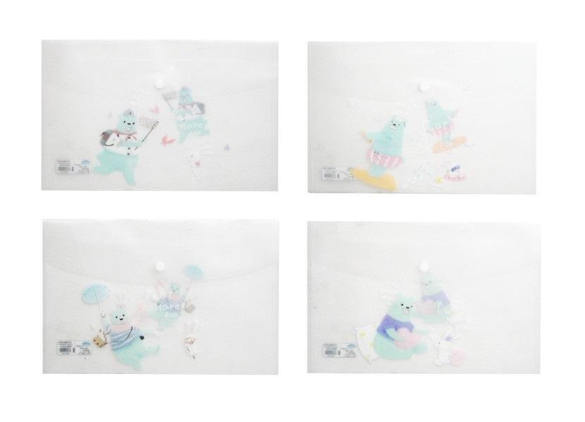 Teczka kopertowa transparentna z misiami. Dostępna w 4 kolorach. Zamykana na zatrzask.format A4. Produkt dostępny w kilku wersjach kolorystycznych, wybierany losowo. Cena dotyczy jednej sztuki.