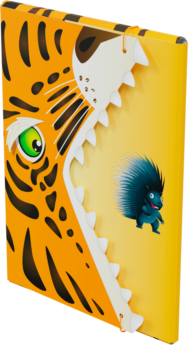 Tygrys jest bardzo silnym zwierzęciem, jest drapieżnikiem. Mogłoby się wydawać, że ten malutki jeżozwierz wcale nie ma z nim szans. Ale czy na pewno? To, że ktoś jest wielki nie oznacza, że wszystko może, że niczego się nie boi, że sprosta każdemu zadaniu. A gdyby tak spojrzeć trochę bardziej metaforycznie na teczkę. Ja to ten mały jeżozwierz, tygrys to wyzwanie, czyli coś co muszę zrobić, ale strasznie mnie to przeraża. Zupełnie nie wiem jak mam się zabrać do tego tematu. Bo co ja mogę? Jestem tylko małym, nic nie potrafiącym jeżozwierzem! A teraz spójrzmy na to inaczej. Tygrys, ten wielki zły zwierzak ma szeroko otwarta paszczę z tymi ogromnymi wielkimi zębami, a jeżozwierz jest taki uśmiechnięty jakby właśnie wygrał na loterii! Czysta abstrakcja? A może jednak coś w tym jest? Są takie chwile w życiu, gdy myślimy że już nie damy rady, że nie możemy niczego osiągnąć, że do niczego się nie nadajemy. Każdy może mieć chwilę słabości. To zupełnie naturalne. Ale życie to nie bajka, to ciągłe wyzwania. To jak je przeżyjemy zależy od nas, od naszego nastawienia. Może zamiast mówić: to się nie uda, lepiej pomyśleć: dam radę, a przynajmniej spróbuję!. Oczywiście nie jest to łatwe zadanie, ale jeżeli coś jest trudne do osiągnięcia, to później kiedy się już z tym uporamy, nasza satysfakcja jest o wiele większa! Zamiast od razu dawać za wygraną, warto jest przynajmniej spróbować uporać się z danym zadaniem czy problemem. Niech ten uśmiechnięty jeżozwierz będzie motywacją do działania! Niech ta teczka pomoże uporządkować ważne dokumenty. Niech ten tygrys ucieka w siną dal i zabierze ze sobą zmartwienia. Jedna teczka, niby tylko teczka, a jednak tak bardzo może dać do myślenia i być może zachęcić do działania! Powodzenia!