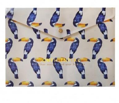Teczka na dokumenty w formacie A4 z modnym letnim nadrukiem egzotycznych ptaków. Stylowy element wyposażenia domowego biura. Pomieści wszystkie niezbędne dokumenty.