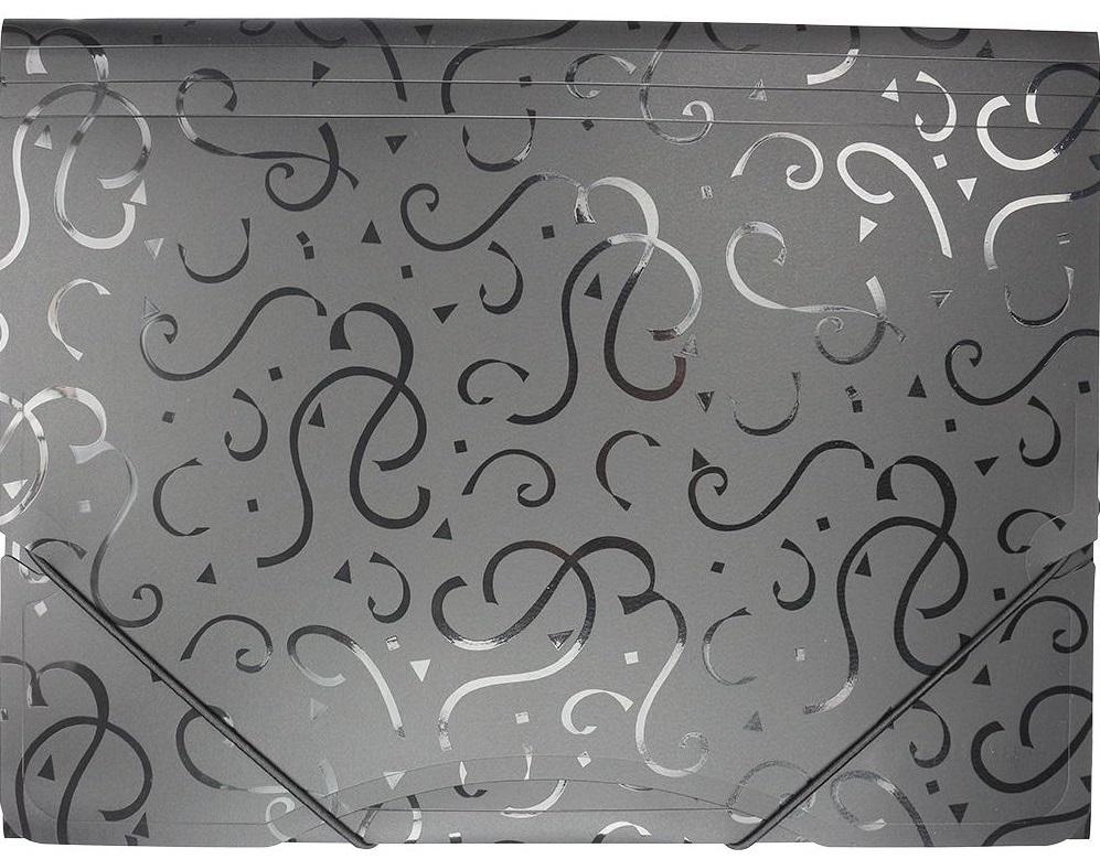 Regulowana grubość grzbietu, wykonana z twardego, kolorowego polipropylenu w tłoczone atrakcyjne wzory. Posiadają 3 zakładki zabezpieczające, zamykana za pomocą narożnych gumek w kolorze teczki. Pakowane po 1 sztuce w woreczek foliowy. Kolor: czarna.