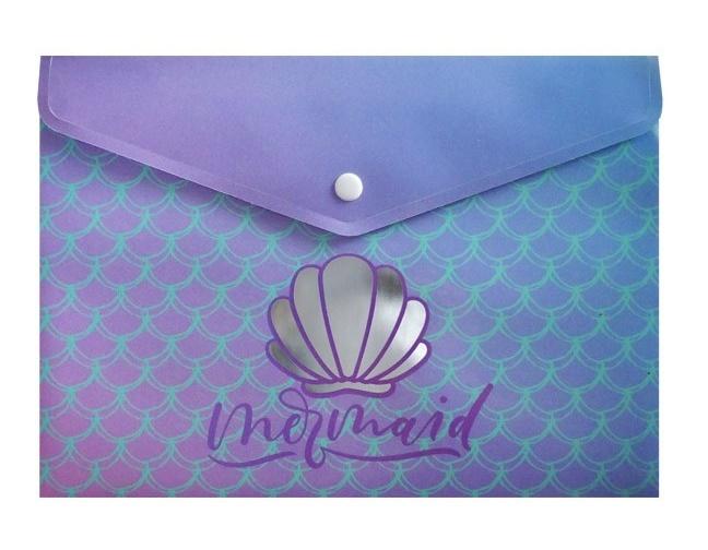 Teczka w formacie A5 holograficzna z napisem Mermaid oraz muszlą. Zapinana na zatrzask.