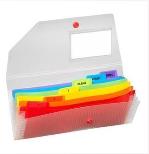 Teczka w formacie DL. Wykonana z polipropylenu. W środku znajduje się 6 kolorowych przekładek z indeksem. Na zewnątrz posiada miejsce na wsunięcie wizytówki. Zamykana na zatrzask.