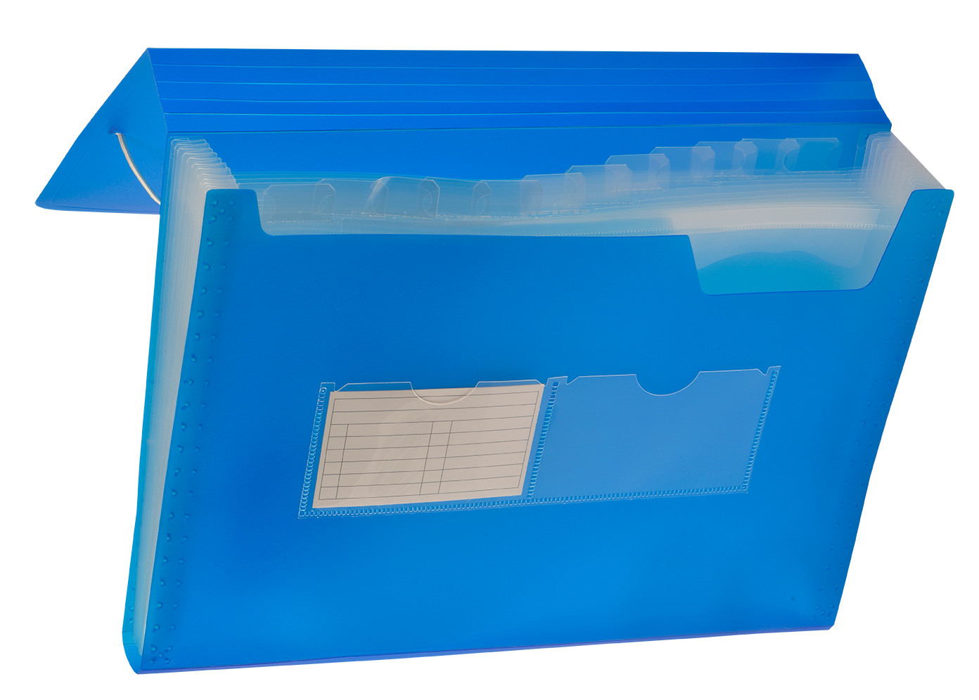 Teczka harmonijkowa PP z gumką, mieszcząca format A4. Teczka posiada 13 przegród. Wymiary teczki: 330x245x32 mm, grubość tworzywa PP: 0,60 mm. Dostępna w czterech kolorach (niebieski, czerwony, pomarańczowy, żółty). Opakowanie: folia 1 szt.