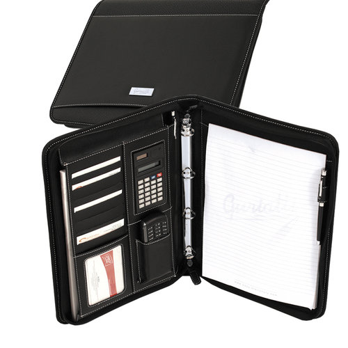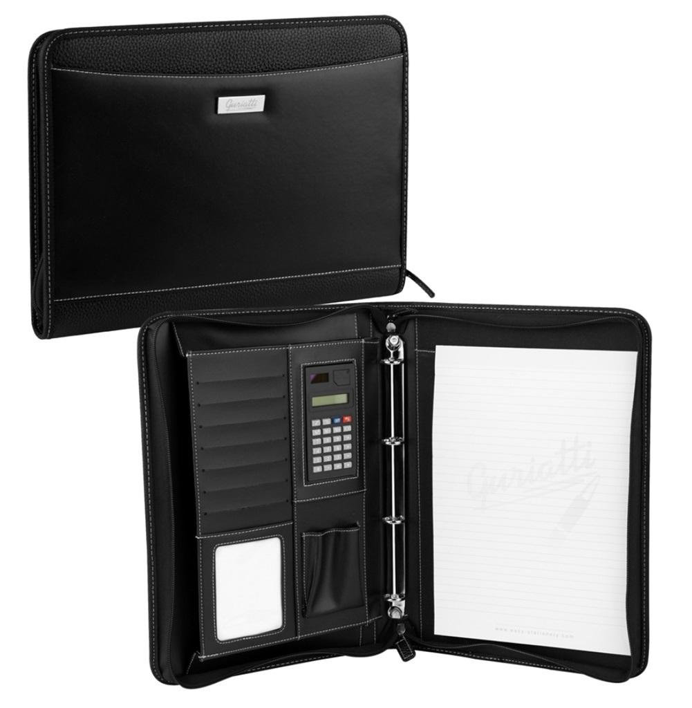 Teczka konferencyjna "-materiał: czarny PU i PVC -rozmiar: 27,5x35,5 cm -łatwa w czyszczeniu Wnętrze: -kieszeń na dokumenty -8 kieszeni na karty -kalkulator -kieszeń na telefon -kieszeń z notatnikiem (20 kartek w linie) -uchwyt na pióro -4-ringowy segregator "