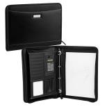 Teczka konferencyjna "-materiał: czarny PU i PVC -rozmiar: 27,5x35,5 cm -łatwa w czyszczeniu Wnętrze: -2 kieszenie na dokumenty -kieszeń na suwak -4 kieszenie na karty -3 uchwyty na pióro -kieszeń z notatnikiem (20 kartek w linie) -kalkulator -4-ringowy segregator "