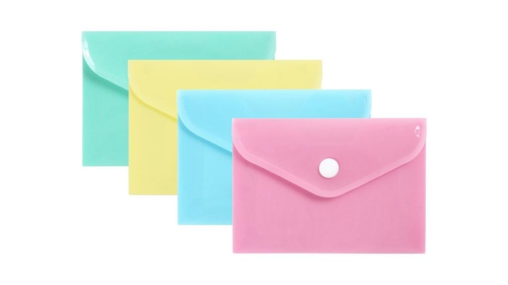 Teczka kopertowa wykonana z folii PP w kolorze pastelowym. Zamykana na wygodny nap zabezpieczający zawartość przed wypadaniem. Idealna do przechowywania drobnych przedmiotów, banknotów czy notatek itp. Format A7. Mix kolorów w opakowaniu.