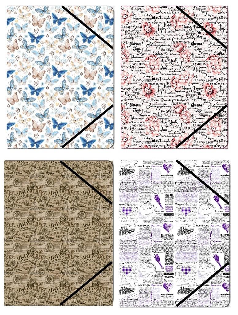 Ozdobna teczka na dokumenty formatu A5, zamykana na gumkę. Dostępna w czterech wzorach.