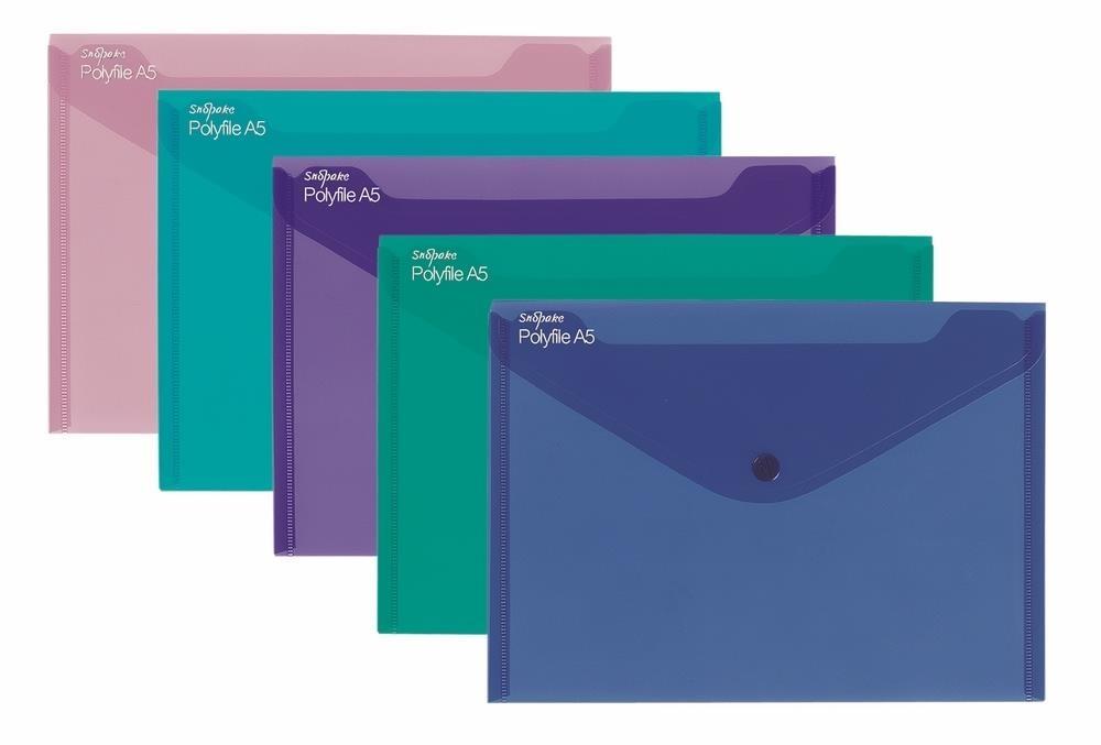 Teczka kopertowa A5 z polipropylenu. Zamykana na zatrzask, mix kolorów, 5 sztuk w opakowaniu zbiorczym.Snopake uznawany jest za lidera w tworzeniu wysokiej jakości, funkcjonalnych i niedrogich produktów do przechowywania i prezentacji dokumentów. Idealnie dopracowane szczegóły, jakość oraz wyjątkowe wzornictwo to znak rozpoznawczy marki. Firma błyskawicznie rozwinęła się w 1955 roku, kiedy pojawiły się pierwsze korektory w płynie marki Snopake. W 1988 roku opracowano pierwsze polyfile - teczki polipropylenowe, które odniosły jeszcze większy sukces. Do dnia dzisiejszego sprzedawane są na całym świecie co 6 minut. Każdy produkt jest testowany na wytrzymałość, użyteczność i trwałość. Wszelkie szczegóły, takie jak zwiększenie wytrzymałości, trwałości produktu są dokładnie przemyślane i wykonane. Opracowane w 2005 urządzenia biurowe Swordfish pobiły serca wszystkich Europejczyków. Oryginalne, wysokiej jakości niszczarki, temperówki, trymery i laminatory charakteryzują się najwyższą starannością wykonania, nowoczesną stylistyką, ale przede wszystkim wysoką funkcjonalnością.