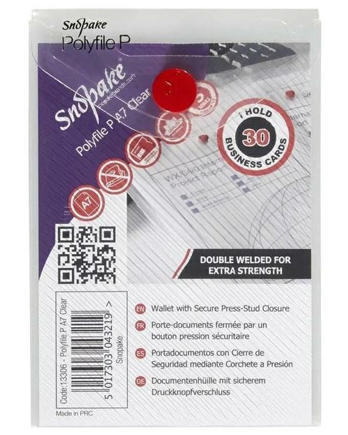 Koperta pionowa marki Snopake, rozmiar mieszczący A7, wykonana z przezroczystego polipropylenu. Posiada zamknięcie na zatrzask oraz podwójne zgrzewy. Specyfikacja: - format A7 (115mm x 80mm) - mieści do 30 kartek/wizytówek - zamknięcie na zatrzask. Cena dotyczy 5 teczek.