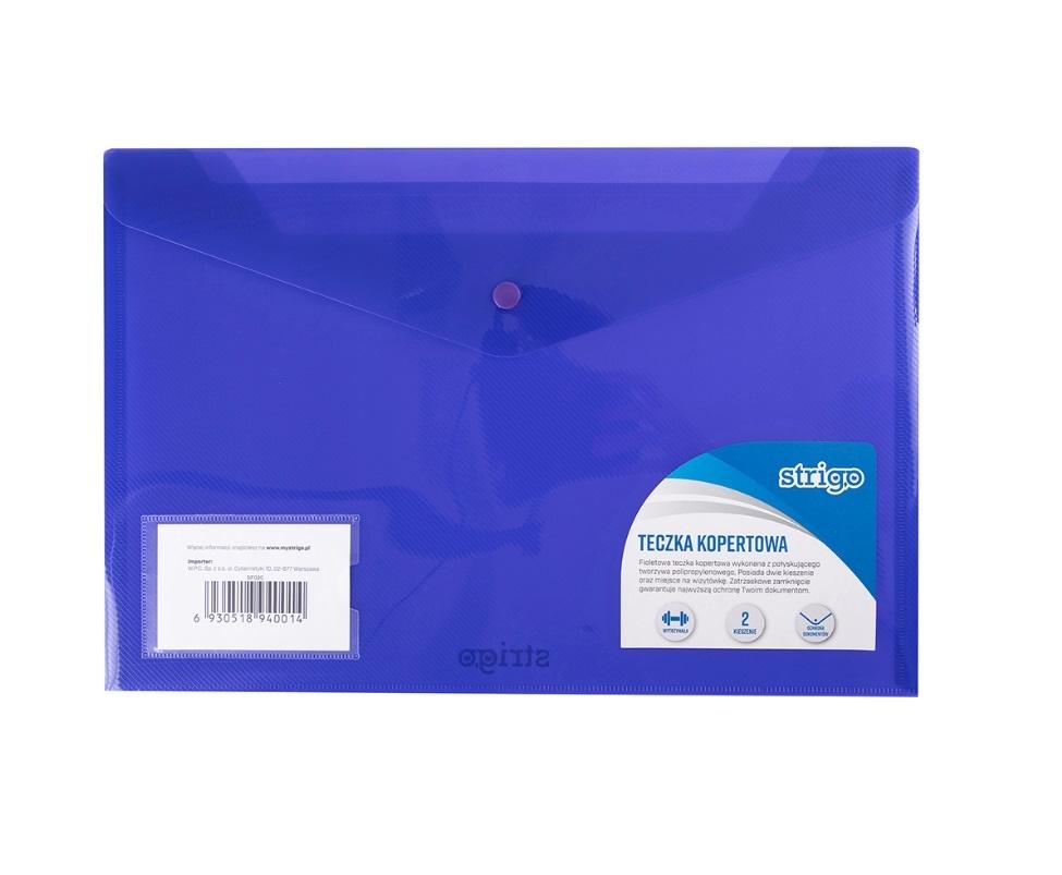 Fioletowa, pozioma teczka kopertowa w formacie A4 plus, posiada dwie kieszenie oraz miejsce na wizytówkę. Zamykana na zatrzask. Opakowanie zbiorcze.