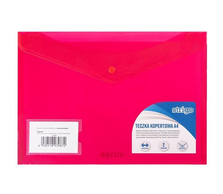 Wykonana z połyskującego tworzywa polipropylenowego. Posiada 2 kieszenie, zatrzaskowe zamknięcie, gwarantujące najwyższą ochronę dokumentom oraz miejsce na wizytówkę. Rozmiar A4, kolor różowy.