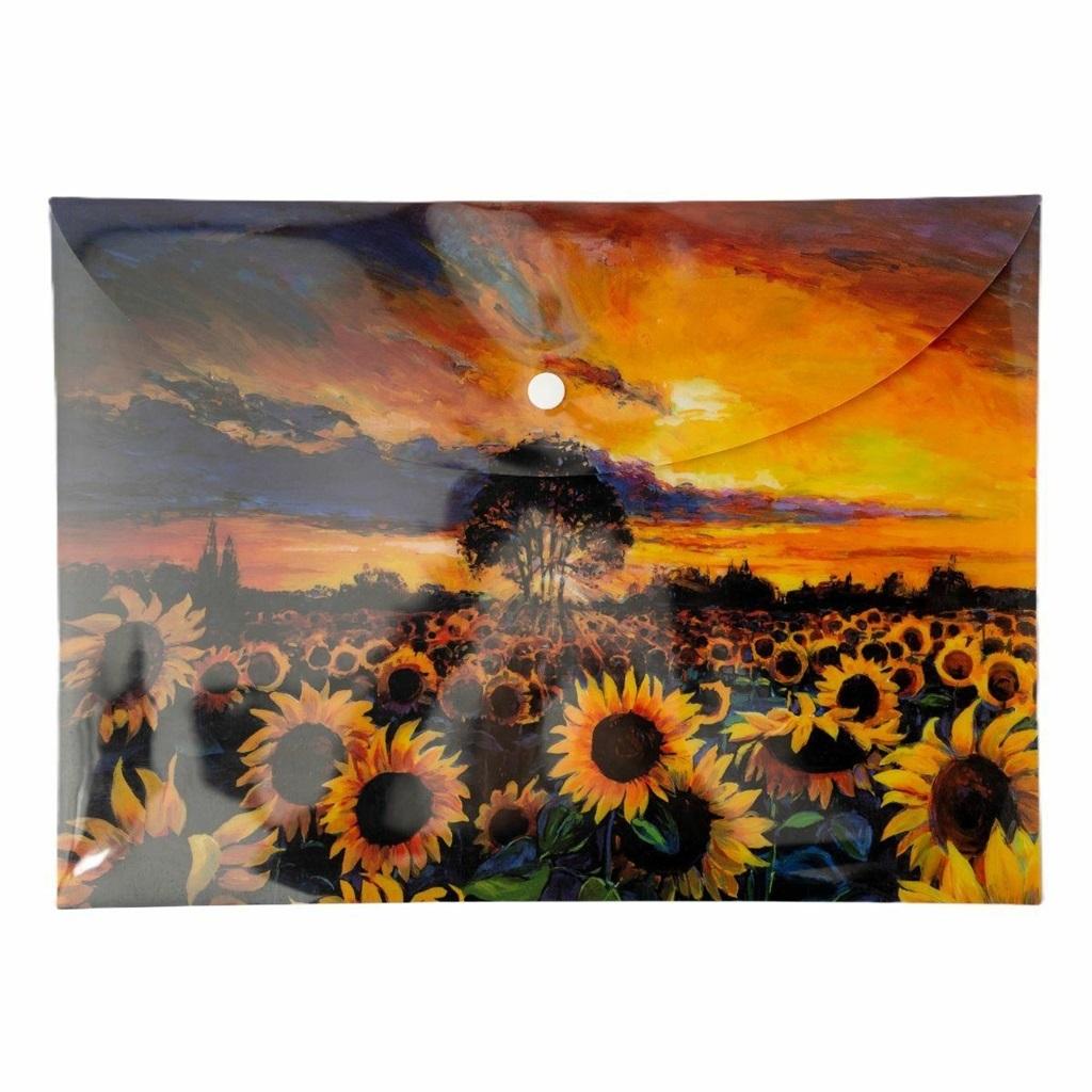 Ozdobna teczka kopertowa VISTA, wykonana z trwałego polipropylenu z nadrukiem w postaci pola słoneczników. Zamykana na zatrzask typu napa. Dzięki pełnemu zadrukowi, zawartość teczki pozostaje niewidoczna na zewnątrz. Idealne rozwiązanie do przechowywania dokumentów lub niewielkich płaskich przedmiotów.