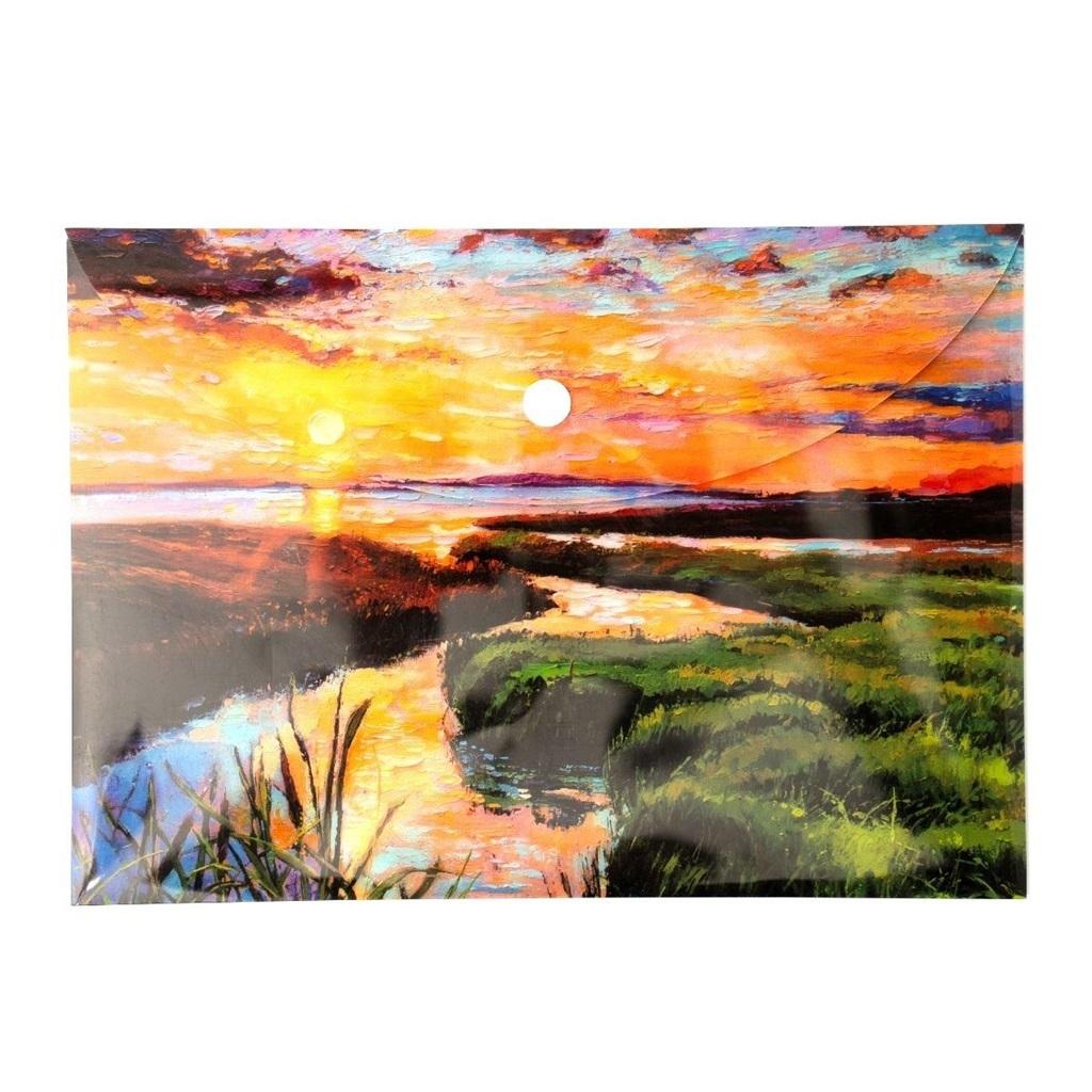 Ozdobna teczka kopertowa VISTA, wykonana z trwałego polipropylenu z nadrukiem w postaci impresjonistycznego widoku ujścia rzeki wpływającej do jeziora. Zamykana na zatrzask typu napa. Dzięki pełnemu zadrukowi, zawartość teczki pozostaje niewidoczna na zewnątrz. Idealne rozwiązanie do przechowywania dokumentów lub niewielkich płaskich przedmiotów.