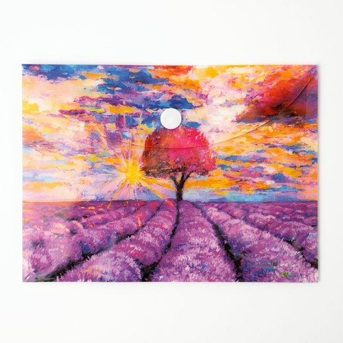 Teczka kopertowa VISTA Lawenda Narcissus, format A6 Ozdobna teczka kopertowa VISTA, wykonana z trwałego polipropylenu z nadrukiem w postaci impresjonistycznego pola lawendy. Zamykana na zatrzask typu napa. Dzięki pełnemu zadrukowi, zawartość teczki pozostaje niewidoczna na zewnątrz. Idealne rozwiązanie do przechowywania dokumentów lub niewielkich płaskich przedmiotów. Specyfikacja: • format A6 (170 x 125 mm) • wykonana z polipropylenu • zamykanie na zatrzask typu napa • grubość tworzywa 28 mikronów