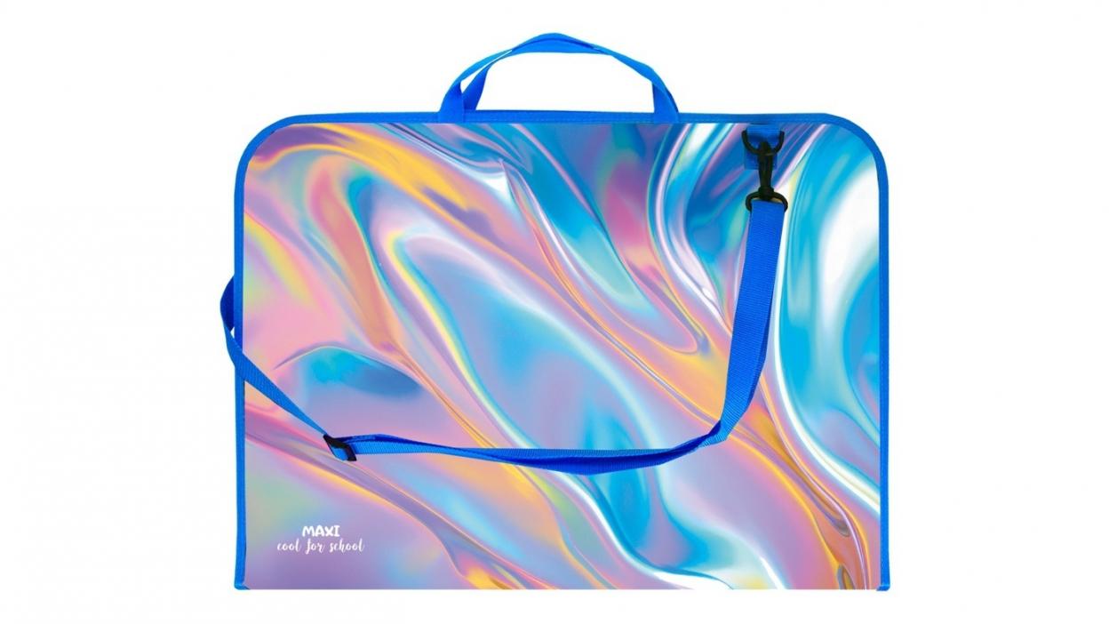 Teczka wykonana ze sztywnego tworzywa PP z ozdobnym nadrukiem oraz obszyciem w kotrastowym kolorze. Wymiary teczki 38x52 cm umożliwiają przechowywanie prac plastycznych w formacie A3 z zapasem miejsca. Wyposażona w zamknięcie na suwak oraz materiałowe rączki i odpinany pasek na ramię. Dodatkowa kieszeń wewnątrz ułatwia utrzymanie porządku przechowywanych prac. Grzbiet o szerokości 3 cm pozwala na przechowywania w teczce przyborów plastycznych.