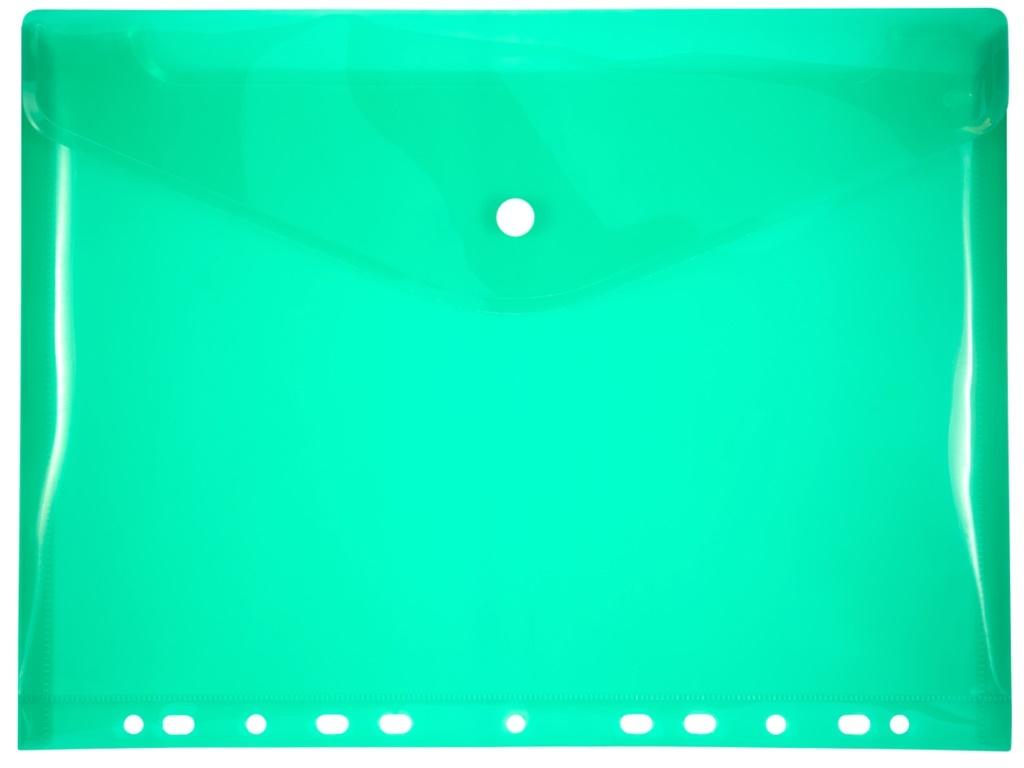Koperta wykonana z kolorowego, transparentnego polipropylenu o grubości 0.18 mm. Zapinana na zatrzask. Europrofaracja umożliwia wpięcie teczki do segregatora, orientacja pozioma, wymiary 31,2x23,5 cm.