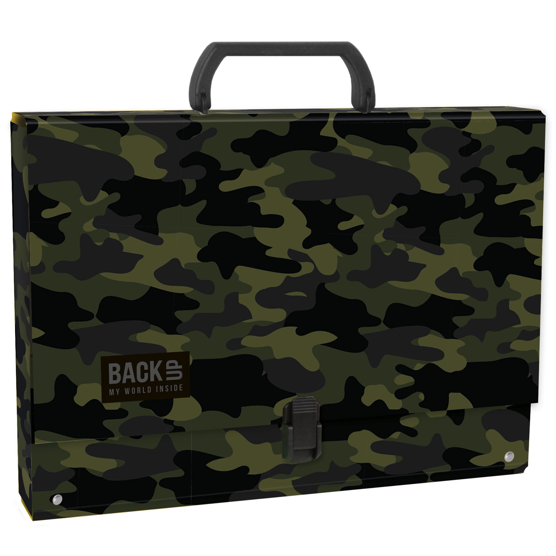 Teczka z rączką w odcieniach khaki. Ponadczasowy wzór moro jest tak uniwersalny jak czerń, pojawia się w zarówno w stylizacjach codziennych, jak również na czerwonych dywanach!