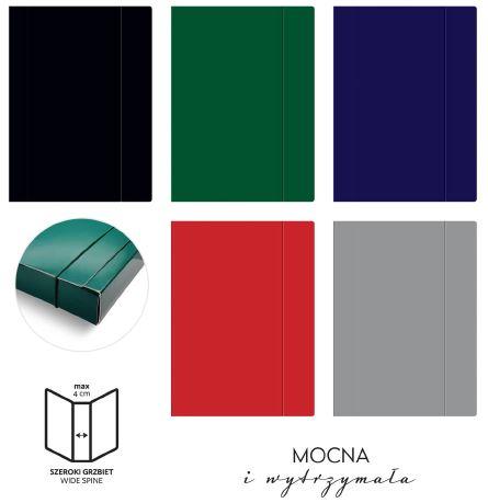 Format: A4+. Jednokolorowa teczka z szerokim grzbietem do 4 cm. Zamykana na gumkę. Wytrzymała i bardzo pojemna. Wykonana z wysokiej jakości kartonu o gramaturze 450 g, pokrytego folią.