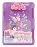 Plastikowa sztywna teczka zamykana na zatrzaski do schowania kartek, rysunków, drobiazgów czy akcesoriów do malowania. Zmieści rozmiar A4. Teczka na przodzie ma ozdobny klips, dzięki któremu można użyć jej również jako podkładki do pisania lub malowania. W zestawie 12 kolorów kredek ołówkowych oraz mini-notes z czystymi kartkami. Idealny zestaw do rozpoczęcia przygody z malowaniem dla małego artysty! Wiek: 5+