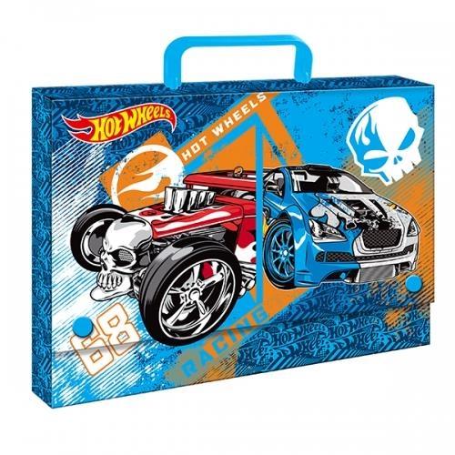 Teczka z grubego, lakierowanego kartonu, zamykana klipsami, wyposażona w solidną rączkę, wzmocniona metalowymi nitami. Idealna na zajęcia pozaszkolne. Ozdobiona wizerunkiem Hot Wheels.
