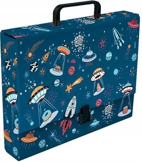 Teczka z rączką z kolekcji Kosmos. Jednokomorowa teczka wykonana z grubej, sztywnej tektury. Rączka i zamek wykonane z plastiku. Produkt idealny na bloki, prace plastyczne oraz wszelkie notatki. Doskonale chroni zawartość przed zniszczeniem. Teczka w formacie A4.