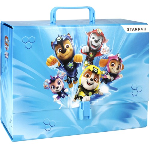 Teczka z rączką z kolekcji STARPAK z licencją Psi Patrol. Sztywna teczka wykonana z grubego, lakierowanego kartonu. Zamykana na plastikowy klips. Teczkę wyposażono w solidną rączkę. Wnętrze teczki ozdobione kolorową grafiką. Teczka o szerokości grzbietu 9,5 cm. Idealnie sprawdzi się na zajęciach pozaszkolnych czy do przechowywania prac dziecka.
