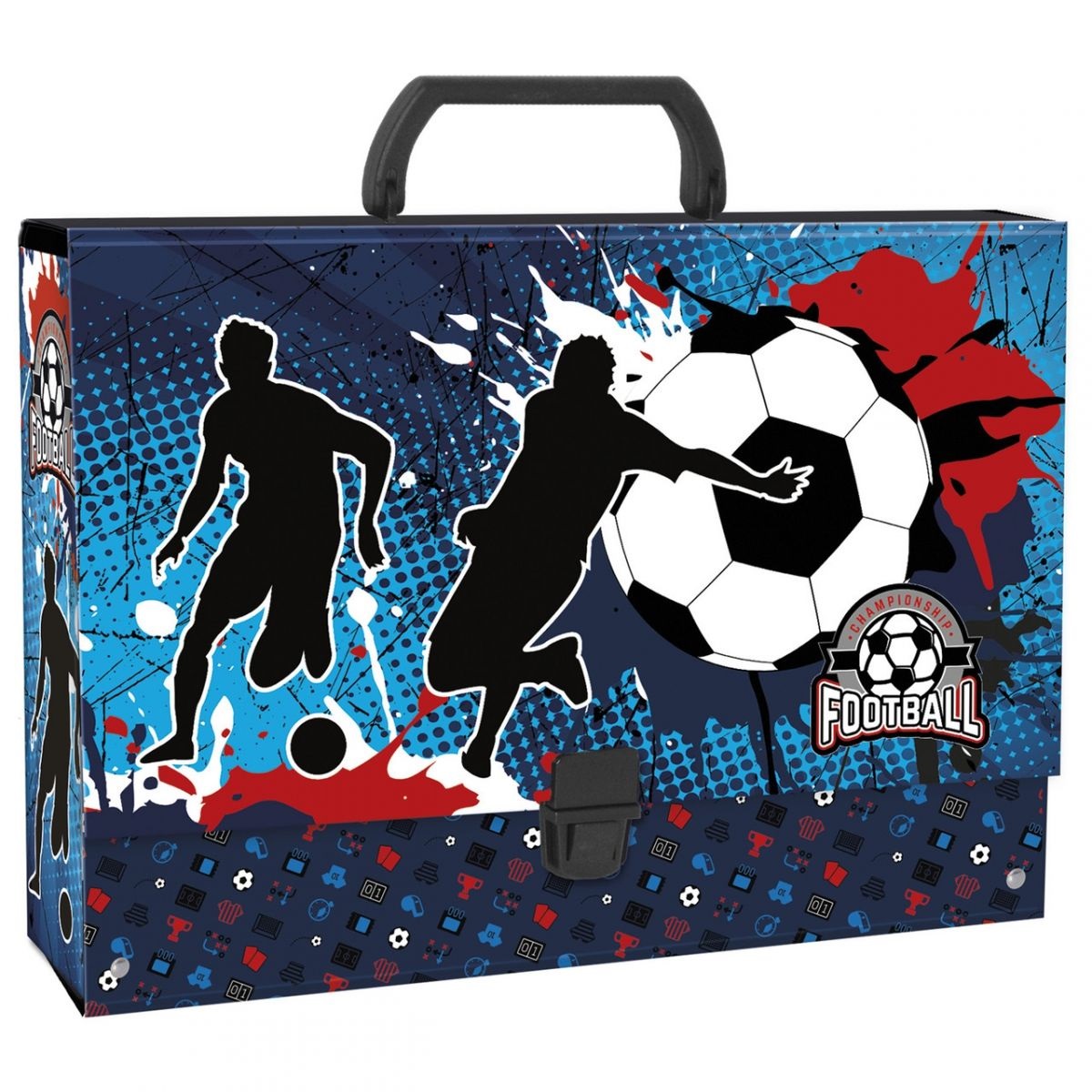 Teczka kartonowa z rączką ozdobiona motywami piłkarskimi.