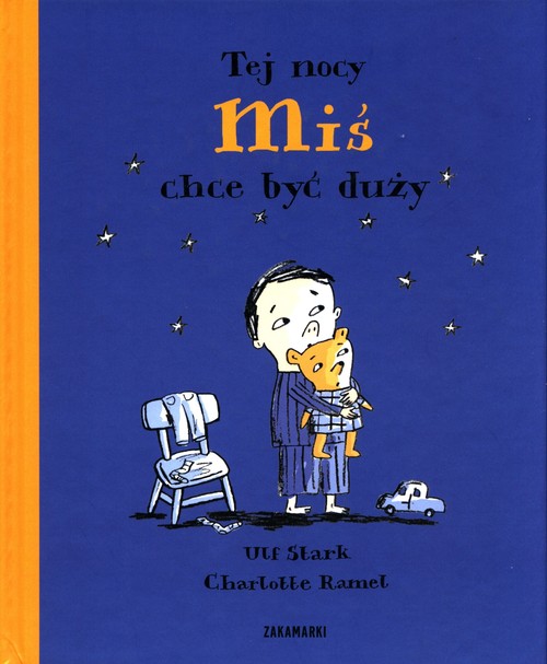 Tej nocy Miś chce być duży i spać sam. Jednak gdy zapada zmrok, ciemność wypełnia się odgłosami. Co to za dźwięk dochodzi z kuchni? Prosta, ciepła historia o zasypianiu. O wieczornych lękach, o bezsenności, o patrzeniu na gwiazdy i nocnym buszowaniu w lodówce. Aż w końcu... przychodzi sen! Ulf Stark to jeden z najwybitniejszych szwedzkich autorów książek dla dzieci i młodzieży. W Polsce ukazało się kilkanaście tytułów jego autorstwa, z czego największą popularością cieszą się „Jak tata pokazał mi wszechświat”, „Jak mama została Indianką” oraz wierszyki o Cynamonie i Trusi. Charlotte Ramel zilustrowała m.in. wiersze Ulfa Starka o Cynamonie i Trusi, książkę Barbro Lindgren „Teraz będziesz kurą”, a także serię Lotty Olsson dla najmłodszych Co Wokoło.