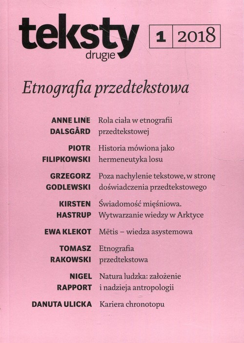 RYSZARD NYCZ Odkrywanie zmysłu udziału TOMASZ RAKOWSKI Etnografia przedtekstowa. Fenomenologiczne korzenie interpretacji antropologicznej PIOTR FILIPKOWSKI Historia mówiona jako hermeneutyka losu. Doświadczenie przedtekstowe GRZEGORZ GODLEWSKI Poza nachylenie tekstowe, w stronę doświadczenia przedtekstowego. Wskazówki terapeutyczne HELENA PATZER Napotkanie przedtekstowego. Budowanie wiedzy etnograficznej o migranckich światach troski KIRSTEN HASTRUP Świadomość mięśniowa. Wytwarzanie wiedzy w Arktyce NIGEL RAPPORT Natura ludzka: założenie i nadzieja antropologii Przeł. O. Kaczmarek , P. Stankiewicz Etnografia przedtekstowa Współpraca merytoryczna: Tomasz Rakowski SEBASTIAN JAGIELSKI Ekstatyczne eksplozje. Wajda, afekty i reparacja DOROTA SAMBORSKA-KUKUĆ Korekty i uzupełnienia do biografii Teodory (Dory) Lebenthal