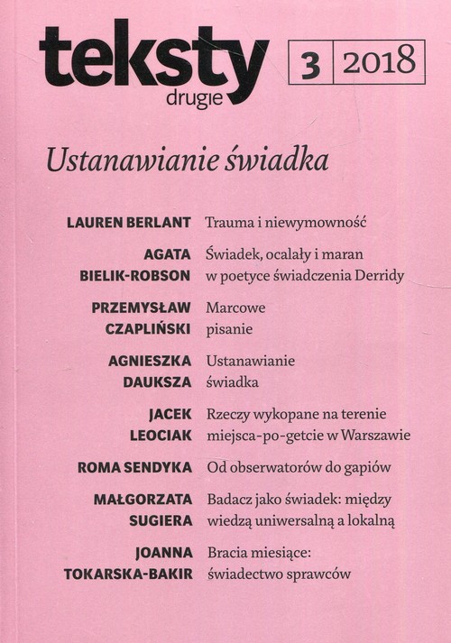 RYSZARD NYCZ - My, świadkowie AGATA BIELIK-ROBSON - Inne testamenty: świadek, ocalały i maran w poetyce świadczenia Derridy JOANNA TOKARSKA-BAKIR - Bracia miesiące: świadectwo sprawców JACEK LEOCIAK - Redefinicja kategorii świadka i świadectwa. (Wokół rzeczy wykopanych na terenie miejsca-po-getcie w Warszawie) AGNIESZKA DAUKSZA - Ustanawianie świadka MARIA BABIŃSKA - wyobrażenia Polaków na temat stosunku do Żydów w czasie okupacji hitlerowskiej ROMA SENDYKA - Od obserwatorów do gapiów. Kategoria bystanders i analiza wizualna ELŻBIETA JANICKA - Obserwatorzy uczestniczący zamiast świadków i rama zamiast obrzeży. O nowe kategorie opisu polskiego kontekstu Zagłady GRZEGORZ MARZEC - Odmowa kapitulacji. O Poetykach pamięci Justyny Tabaszewskiej