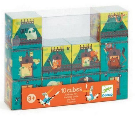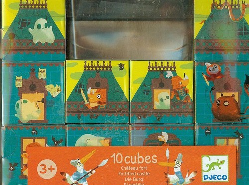 10 tekturowych klocków ( sześciany ), które układając utworzą zamek warowny wraz z mieszkańcami. 10 klocków. Wiek: 3+